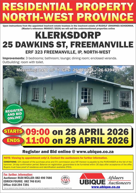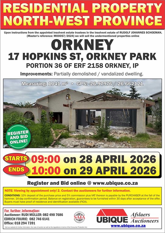MULTIPLE PROPERTY ONLINE AUCTION – ORKNEY, KLERKSDORP & POTCHEFSTROOM
