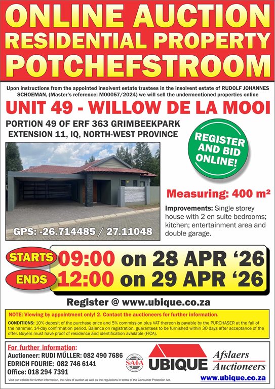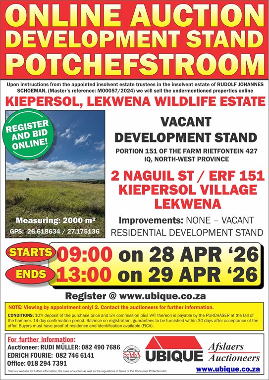 The bidder’s record and the vendor or vendu roll will be made available for inspection at the office of UBIQUE AUCTIONEERS, Plot 469, Vyfhoek, Potchefstroom, during normal business hours free of charge. It will also be available for inspection at the auction.